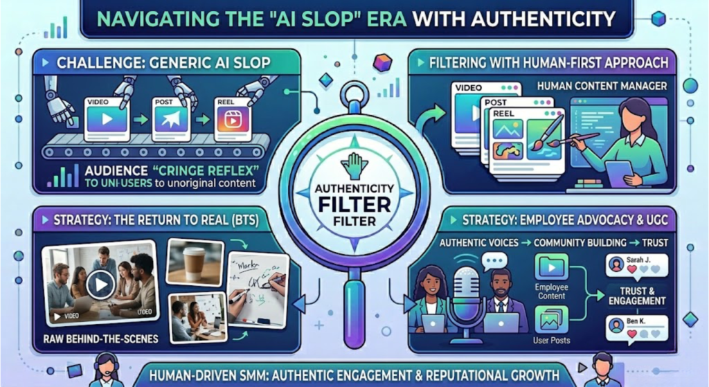 As generative AI becomes table stakes, social feeds are increasingly cluttered with low-quality, generic content often referred to as “AI slop.” While AI is a powerful ally for data analysis and drafting, successful SMM marketing in 2026 requires a “human-first” filter.
