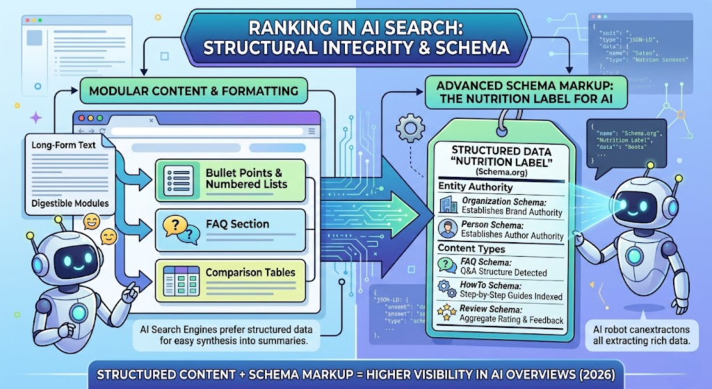 FAQ,HowTo, andReviewschema markup. In 2026,OrganizationandPersonschema are also critical for establishing entity authority.Modular Content: Break long-form prose into digestible modules. Use bullet points, numbered lists, and comparison tables. AI search engines love structured data because it is easier to synthesize into a summary.